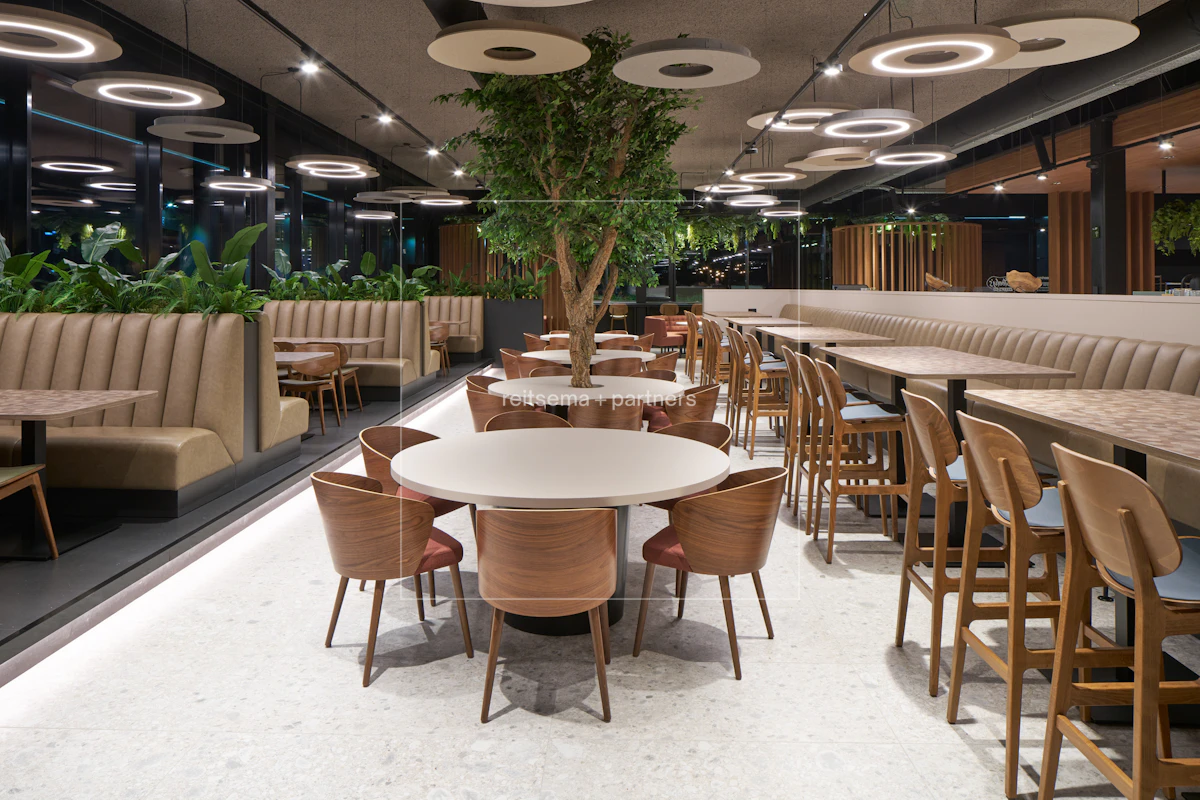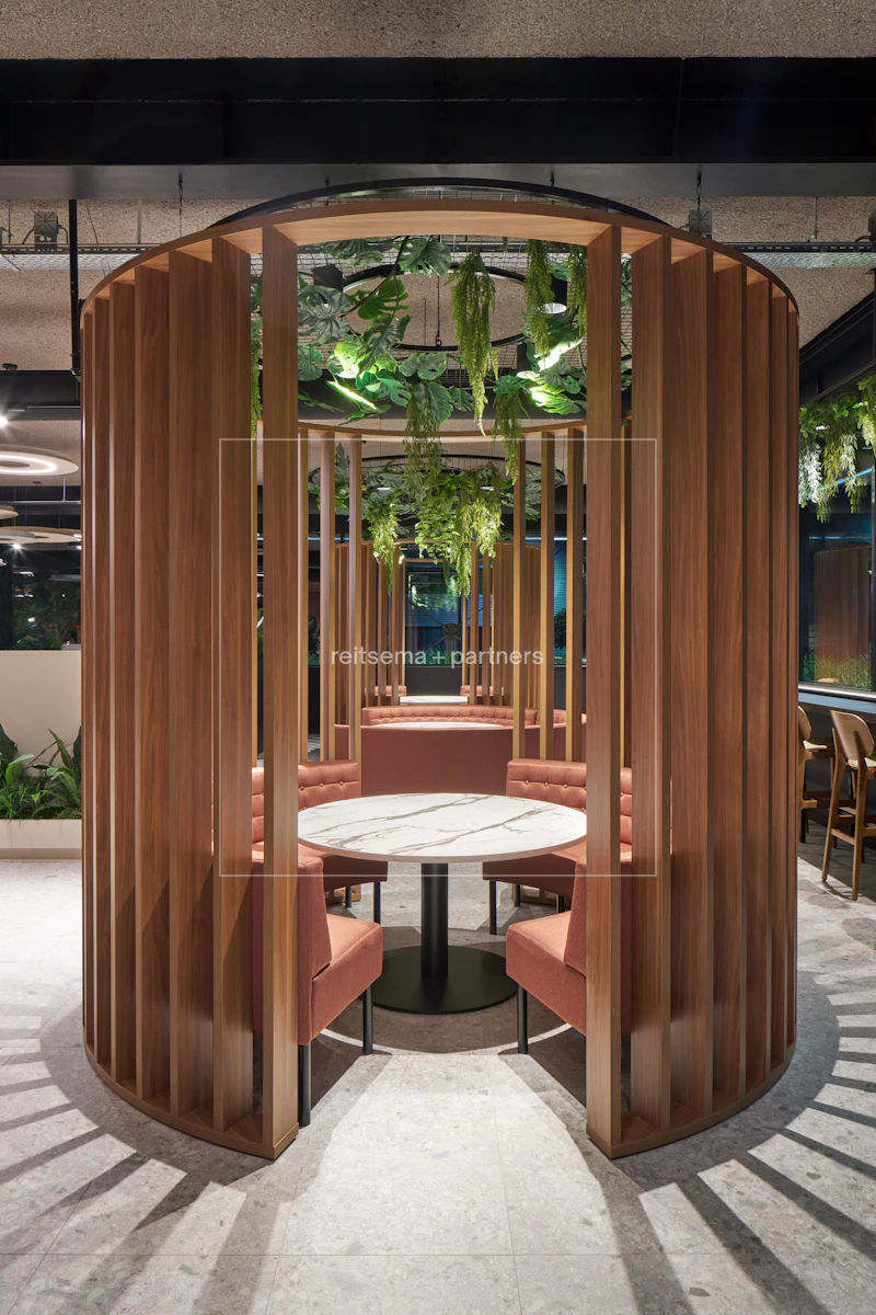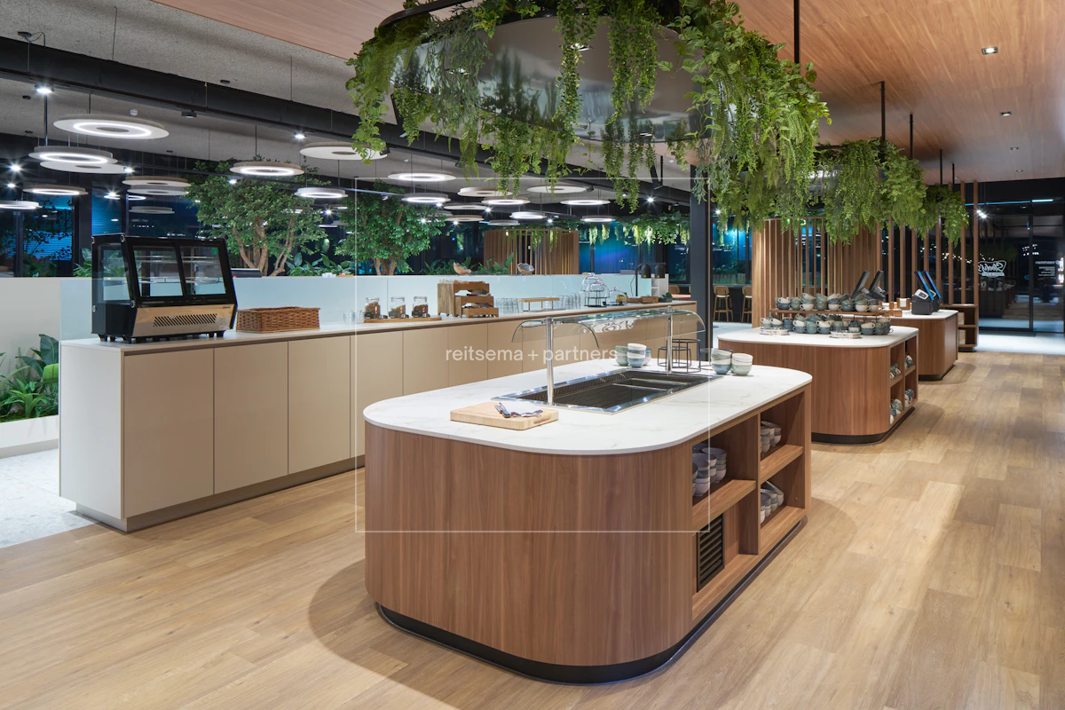 Op de begane grond bevindt zich het bedrijfsrestaurant voor 175 personen, dat fungeert als centrale ontmoetingsplek binnen het gebouw en de verschillende vestigingen. Het restaurant beschikt over een professionele keuken waar mensen met een afstand tot de arbeidsmarkt een werkplek vinden. Aan beide zijden van het restaurant zijn terrassen aangelegd die integraal deel uitmaken van de eetgelegenheid.