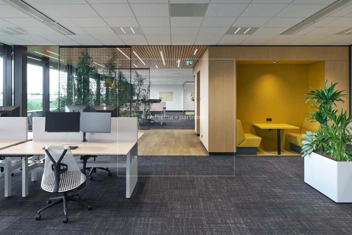De nieuwbouw omvat kantoorruimtes verdeeld over drie verdiepingen, waarbij elke verdieping zijn eigen kenmerkende kleuraccent heeft (groen, blauw of geel). De werkomgeving is opgedeeld in drie zones die te onderscheiden zijn in rust, ruis tot rumoer. Deze werkplekken worden onderbroken door de bouwkundige kernen, die strategisch zijn geplaatst binnen het grid van het gebouw. Deze bouwkundige kernen zijn ontworpen als houten blokken en fungeren als knooppunten in het gebouw. Ze dienen als verbindingspunten tussen de verschillende verdiepingen, maar ook tussen de diverse kantoorzones en de R&D-hal. Hier vinden ontmoetingen plaats in de kantoorvleugels, waar ruimte is voor levendigheid en interactie.